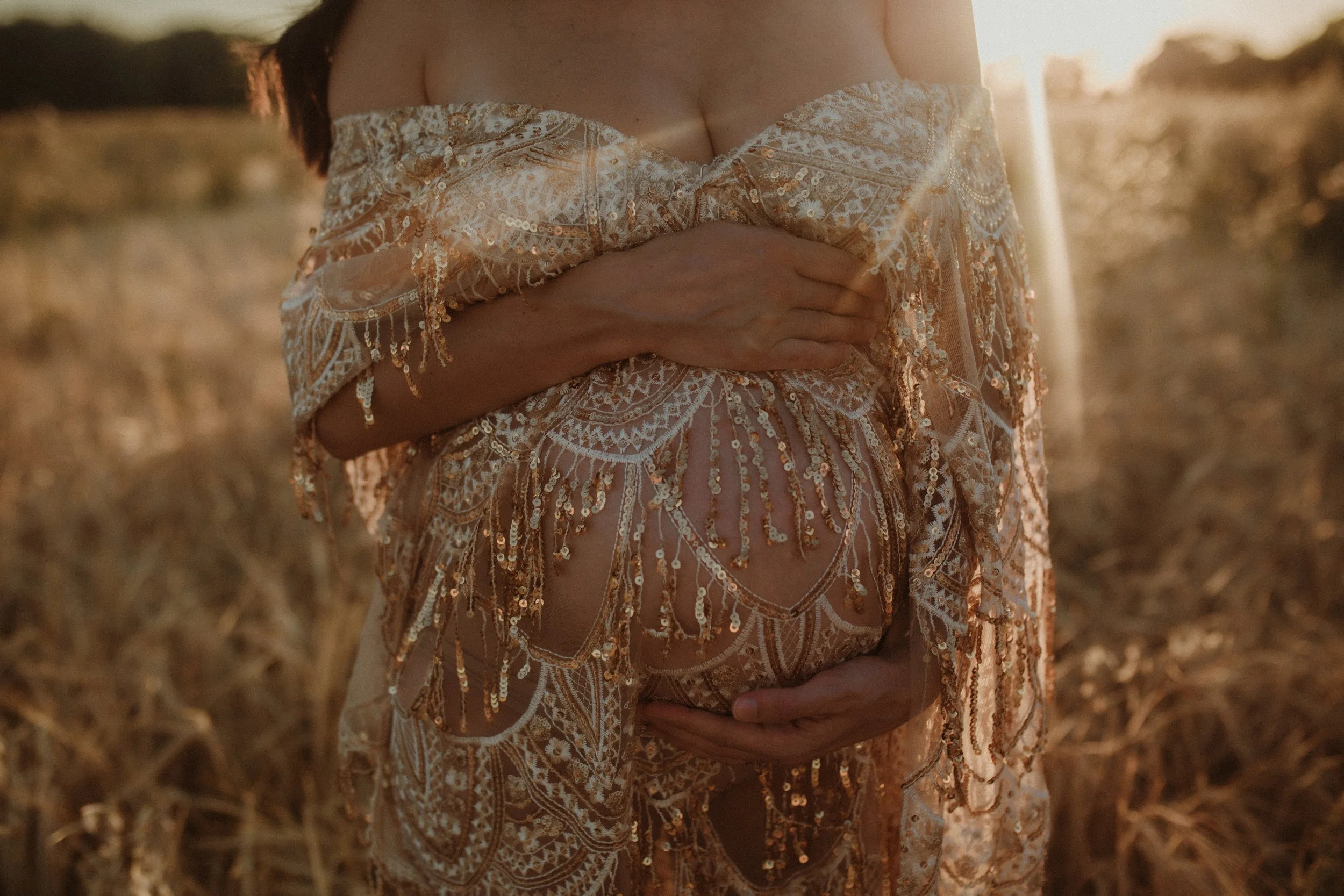 The goldenness of low August sun, love, sequins, goddess energy & a field of corn... this was a recipe for pure magic. Their love for each other was so beautiful to witness, a true love story, so heartwarmingly deep in love with one another & their daughter in utero. I fell for them instantly, completely captivated by them as they swayed to their favourite song “Dancing in the Moonlight”. Their session fell on one of the hottest days of the year, the sky was clear & the sun was golden. Lucia chose the divine gold sequin gown from my client wardrobe, I had found the most incredible corn field that hadn’t yet been cut; I knew it was going to be pure magic… it was meant to be.